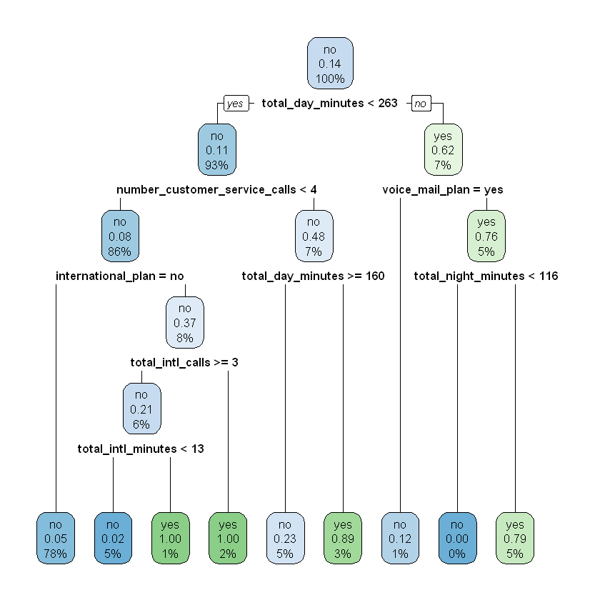 account_lengthless than 87 and atotal_intl_chargegreater than or equal to 3.8, we would move right at the first split and left at the second split of the tree, leading to a prediction of “no churn”.If a new observation has an
