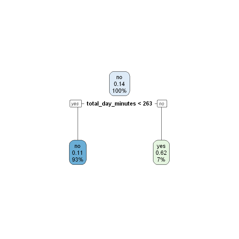 modelDepth1 <- rpart(churn ~ ., data = train, maxdepth = 1)